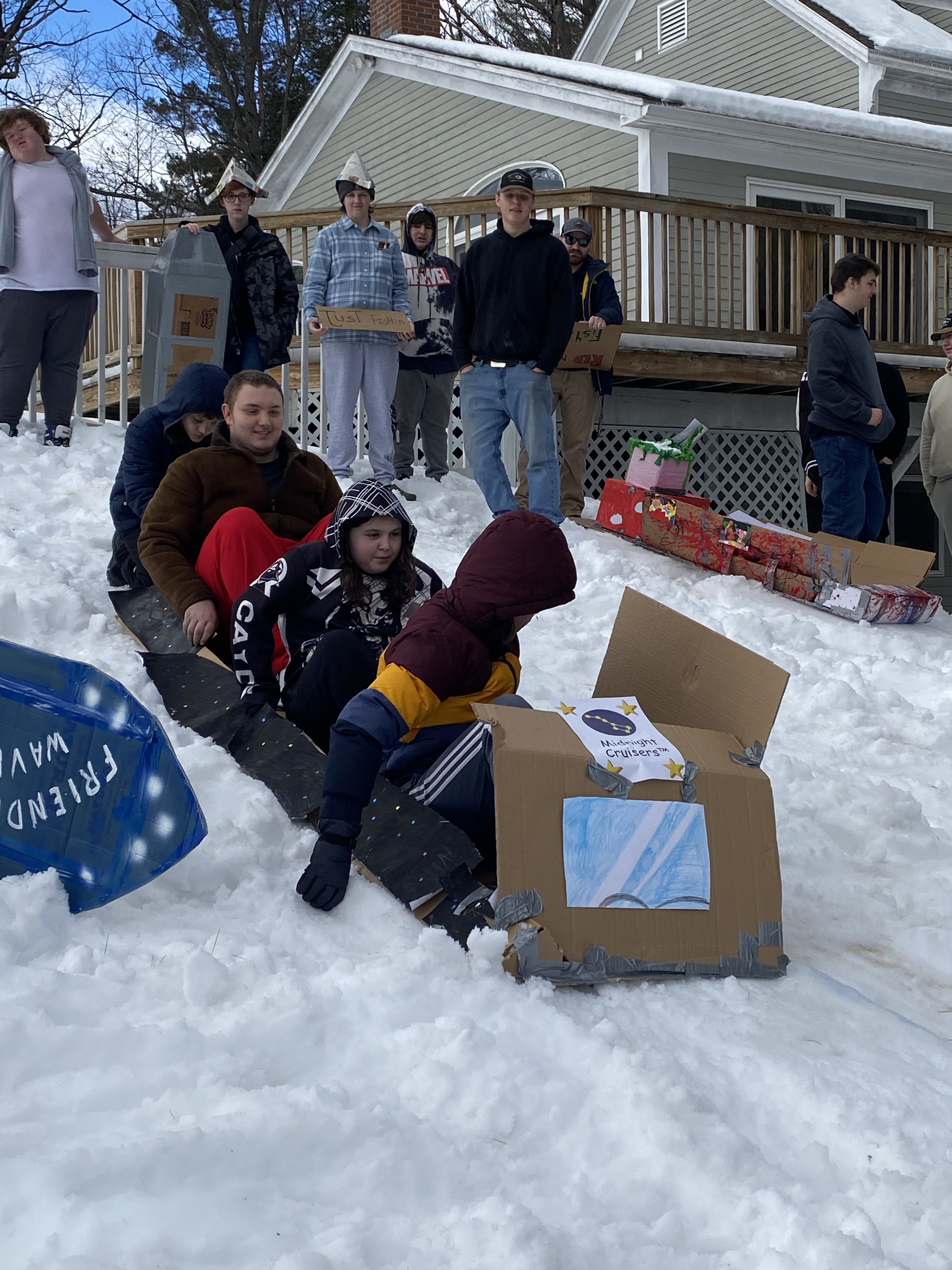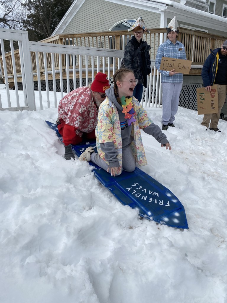 The teams showed great imagination in creating a fishing boat, limousine, Hawaiian surf get- away among other great ideas. Hard work was displayed in sled creation, but sticky wet snow slowed any real progress down the hill. Even with big running starts, most teams only made it half way down. Spirits were not crushed and teams cheered each other on as everyone gave their best effort!