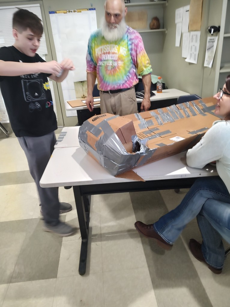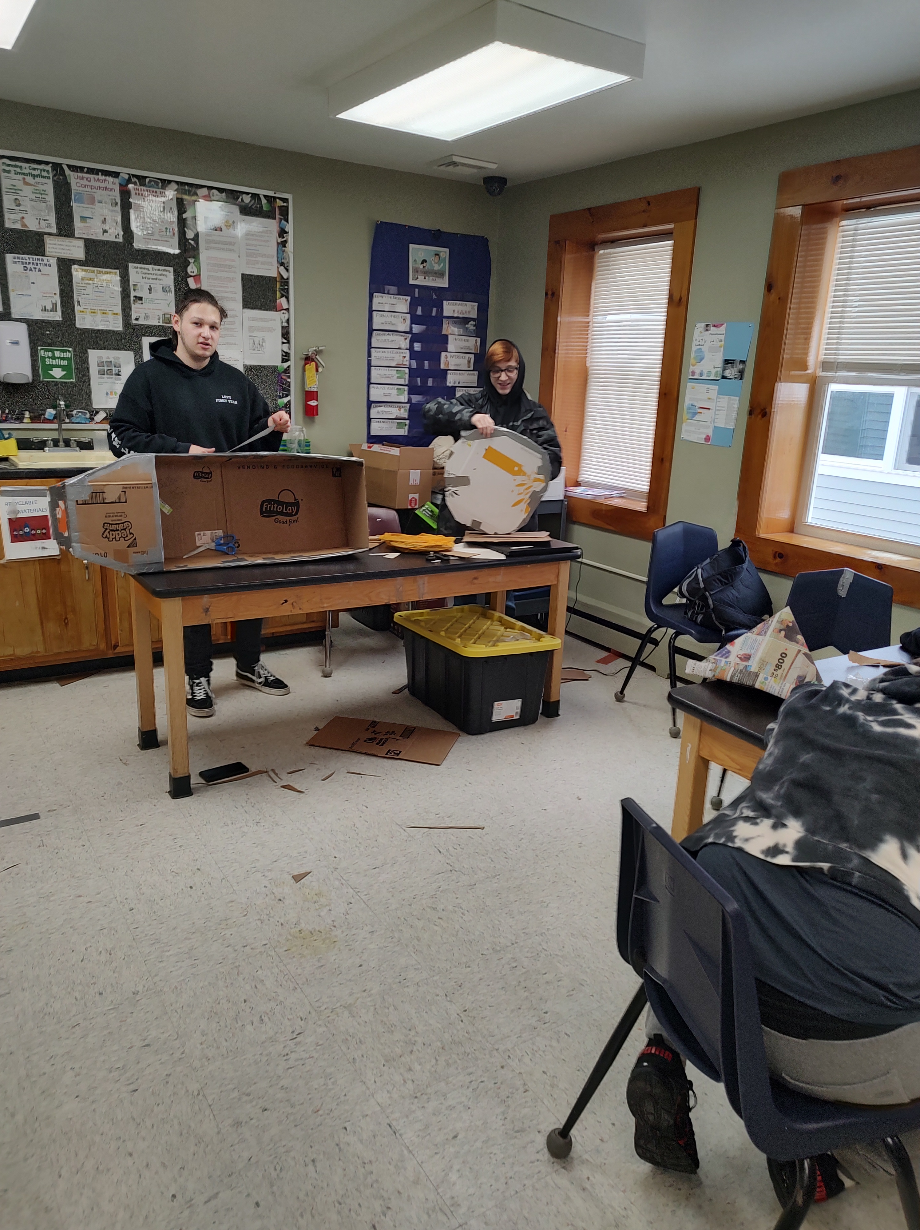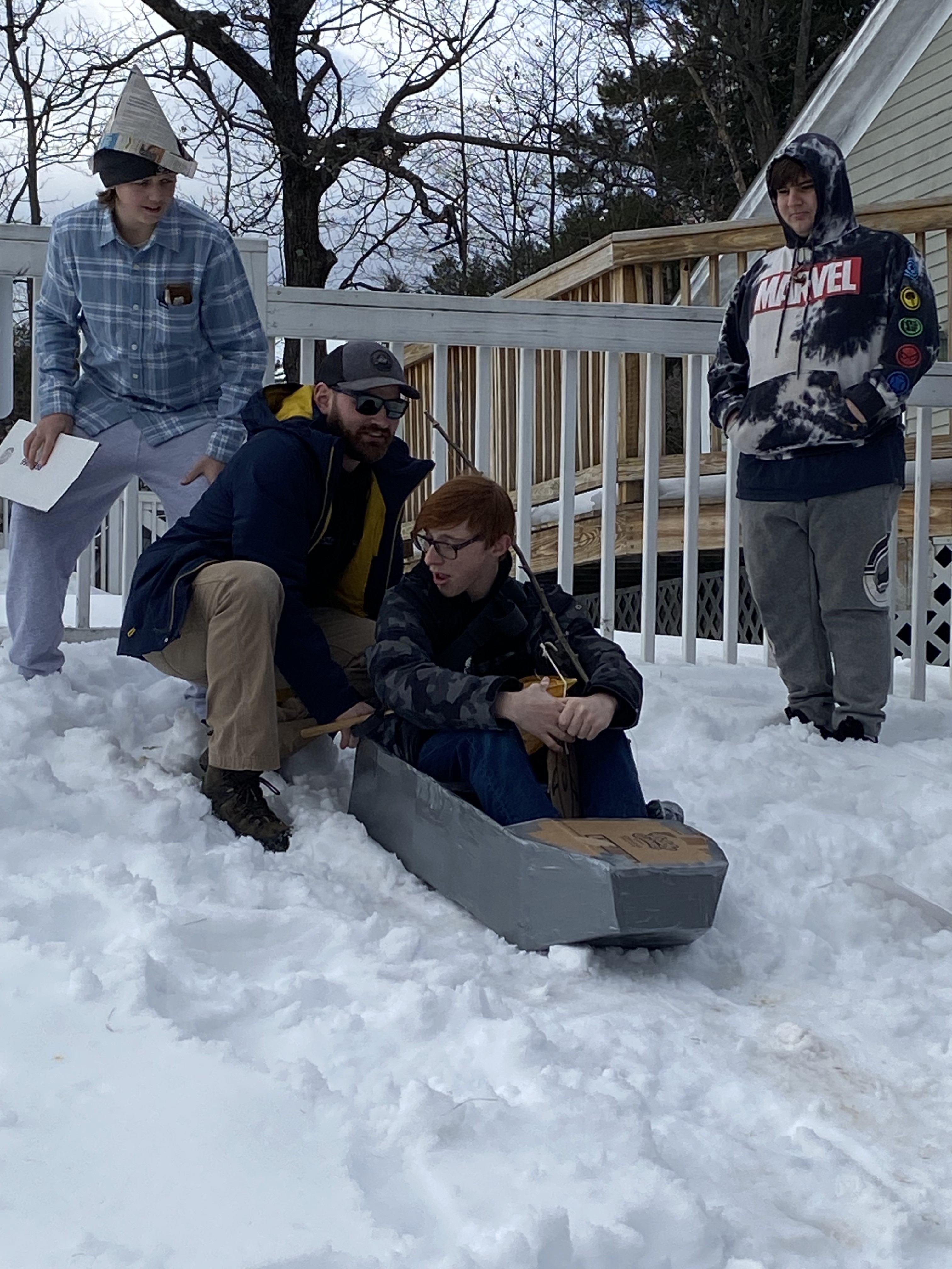 Early in February we once again gathered as a whole school for some friendly competition. This time, with fresh snow on the ground, teams engaged in cardboard sled building and racing. Each team was given a random pile of cardboard and a roll of duck tape then left to their imaginations to come up with a theme, build a sled and get it to the hill for demonstration of sledding skills