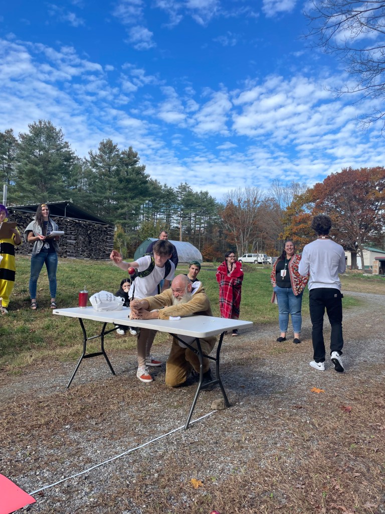 In years past our tradition has been to build machines to launch pumpkins in our big field. This year we decided to mix it up a bit and changed the projectiles to apples. To increase the challenge and level the playing field some, each group was given an identical bag of supplies to create their launcher from. There was a slingshot, a few catapults, and a lever activated tossing machine!