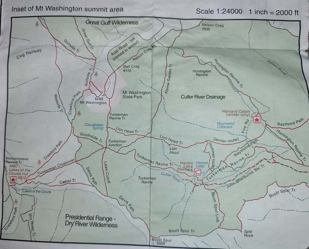 This picture is the inset from map 1 from the AMC Guide to the White Mountains. If you are not familiar, map 1 focuses on the Presidential Range, some of the highest peaks in New Hampshire. The inset then focuses on the summit of Mount Washington, the highest peak in the Northeast. Looking at the map you can see there are three trails to ending, or beginning, at the summit along with the Mt Washington Auto Road and the Cog Railway. On a busy summer day it can be a crowded place with a mix of hikers, train riders, and people walking over from their cars. I have arrived at the summit on foot, by car and by train. When I have hiked it, I always feel it to be a little surreal to wait in line for a summit picture with small dogs and people in flip flops, or to buy a hot dog and fries from a mountain top snack bar.