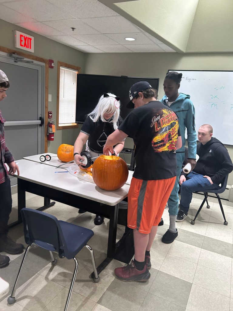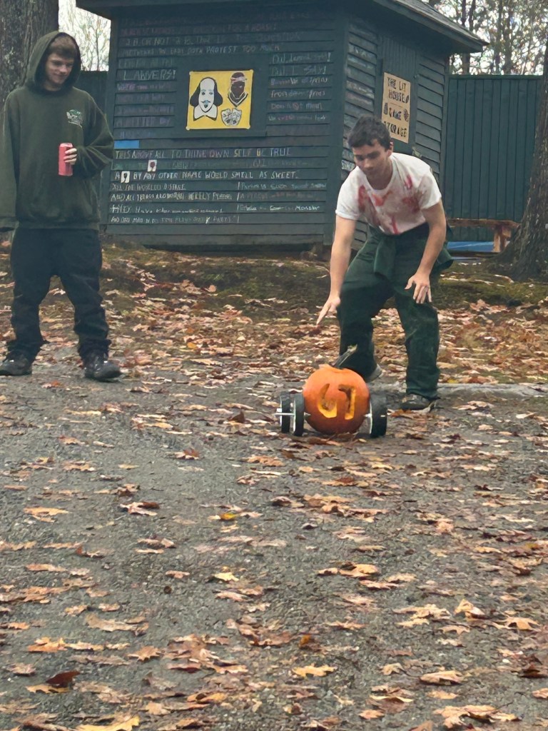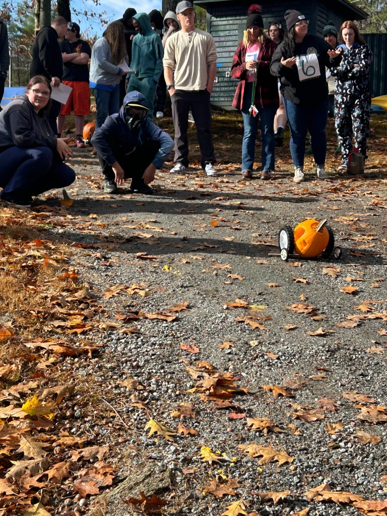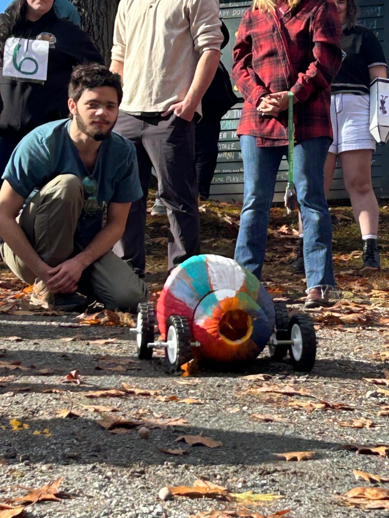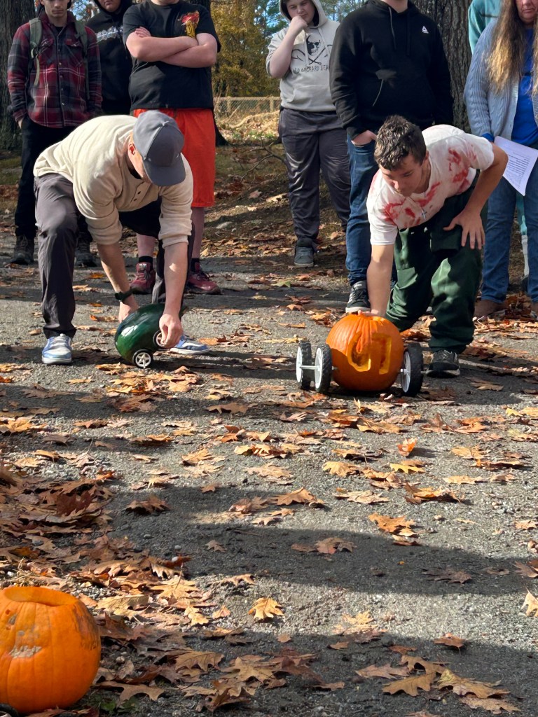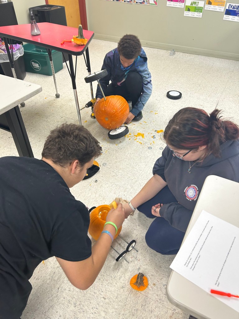 A little slow on the post, but our students participated in a pumpkin racing activity. The straightforward goal was to design a vehicle around a pumpkin with two axels that pass completely through the pumpkin. The trick, as they get started, they are given a second pumpkin and a second full set of wheels and axels!